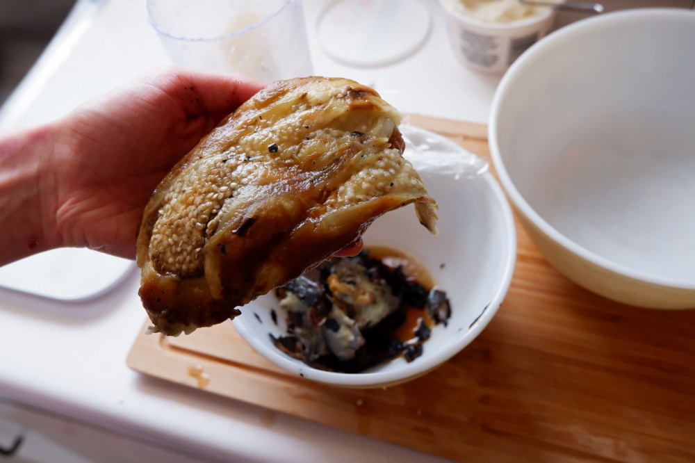 Note: If you do not have a gas stove, you can alternatively roast the eggplant whole in the oven at 400 degree F for 35-45 minutes.