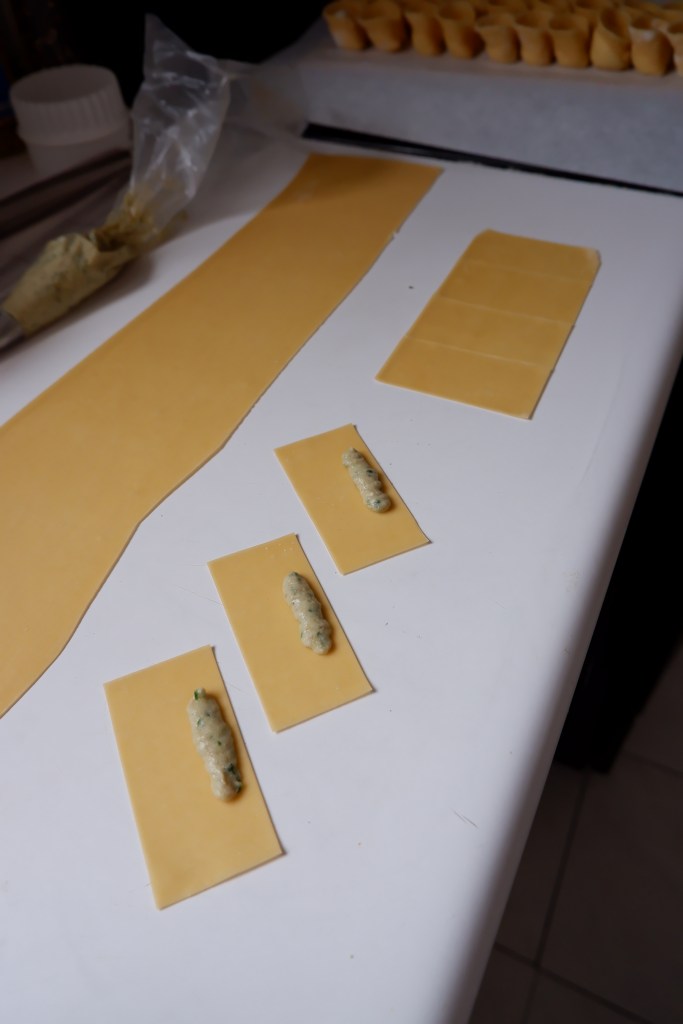 Place the filling in a piping bag fitted with a 1.5cm round tip. Alternatively, you can use a disposable piping bag or plastic bag and simply cut the tip. Pipe a small cylinder of filling along the long side of each rectangle, leaving about 2 cm on each end of filling (see the photo below for reference).