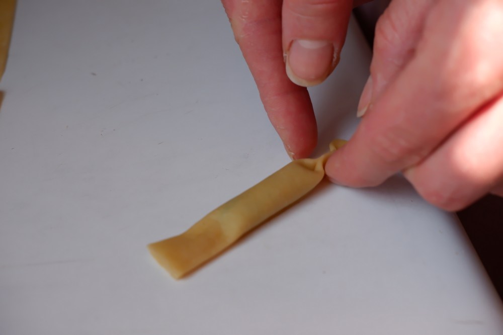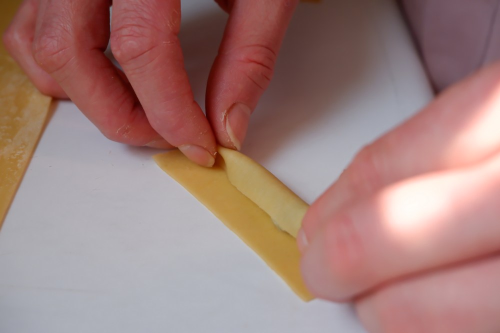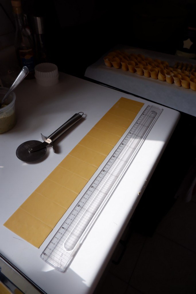 Lay your beautiful, thin pasta sheet out on a very lightly floured surface. Using the ruler, measure and mark the width of the pasta sheet to 8cm. Cut the top and bottom of the pasta sheet using the ruler as a straight surface. You should now have a nice 8cm wide rectangular sheet of dough. Next, mark 4cm pieces along the whole length of the sheet. Cut at each 4cm mark, creating 4cm x 8cm rectangular pieces.