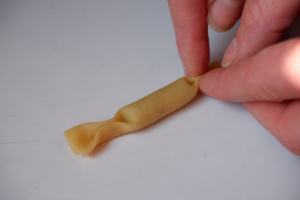 Roll the dough over the filling, forming a long cylinder. Seal the cylinder by brushing the edge of the dough with water and pressing closed. Pinch both ends of the cylinder sealing the filling at the center.