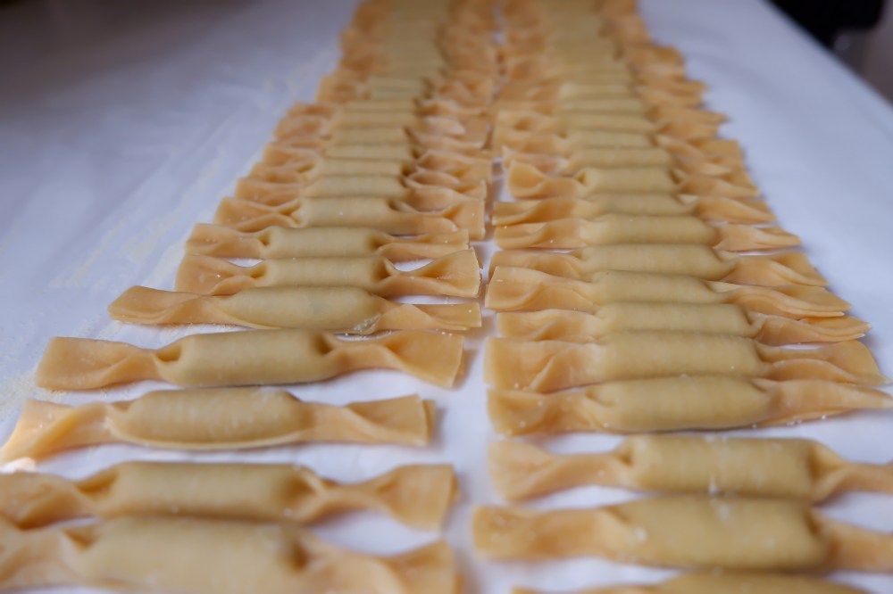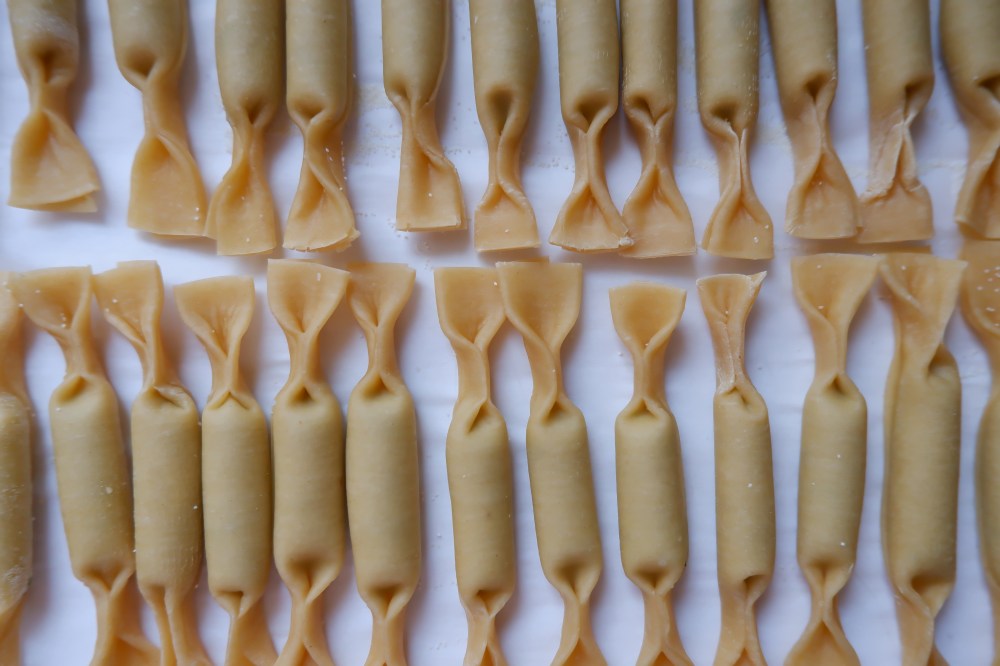 Place your finished pastas on a tray lined with parchment paper. I like to lightly dust the tray with semolina flour but regular flour will work as well.
