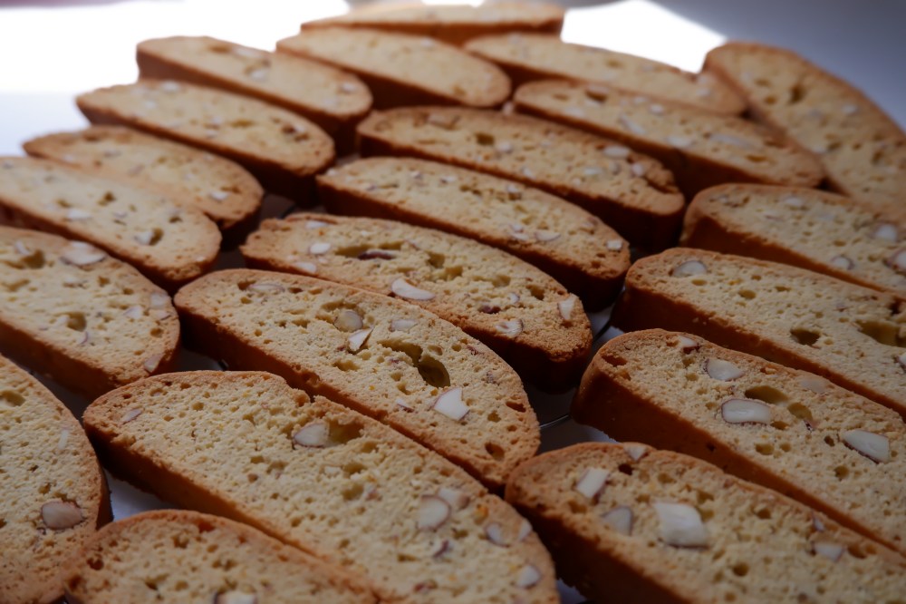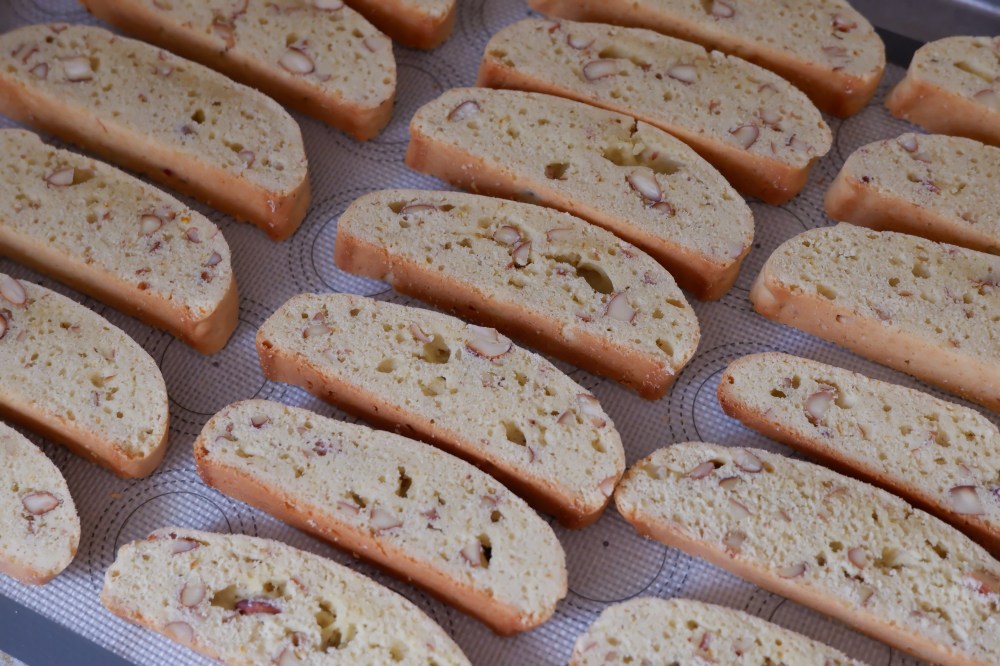 After the first bake, let the log cool completely. Reduce the oven temperature to 325 degrees F. Using a very sharp serrated knife, cut the log into 2cm thick cookies. Place the cut biscotti flat on the baking sheet. They don’t nee to be spaced out for the second bake as the dough will not change in shape of size. Bake the biscotti for 30-35 minutes, or until golden brown. Transfer to a wire rack, and allow to cool.